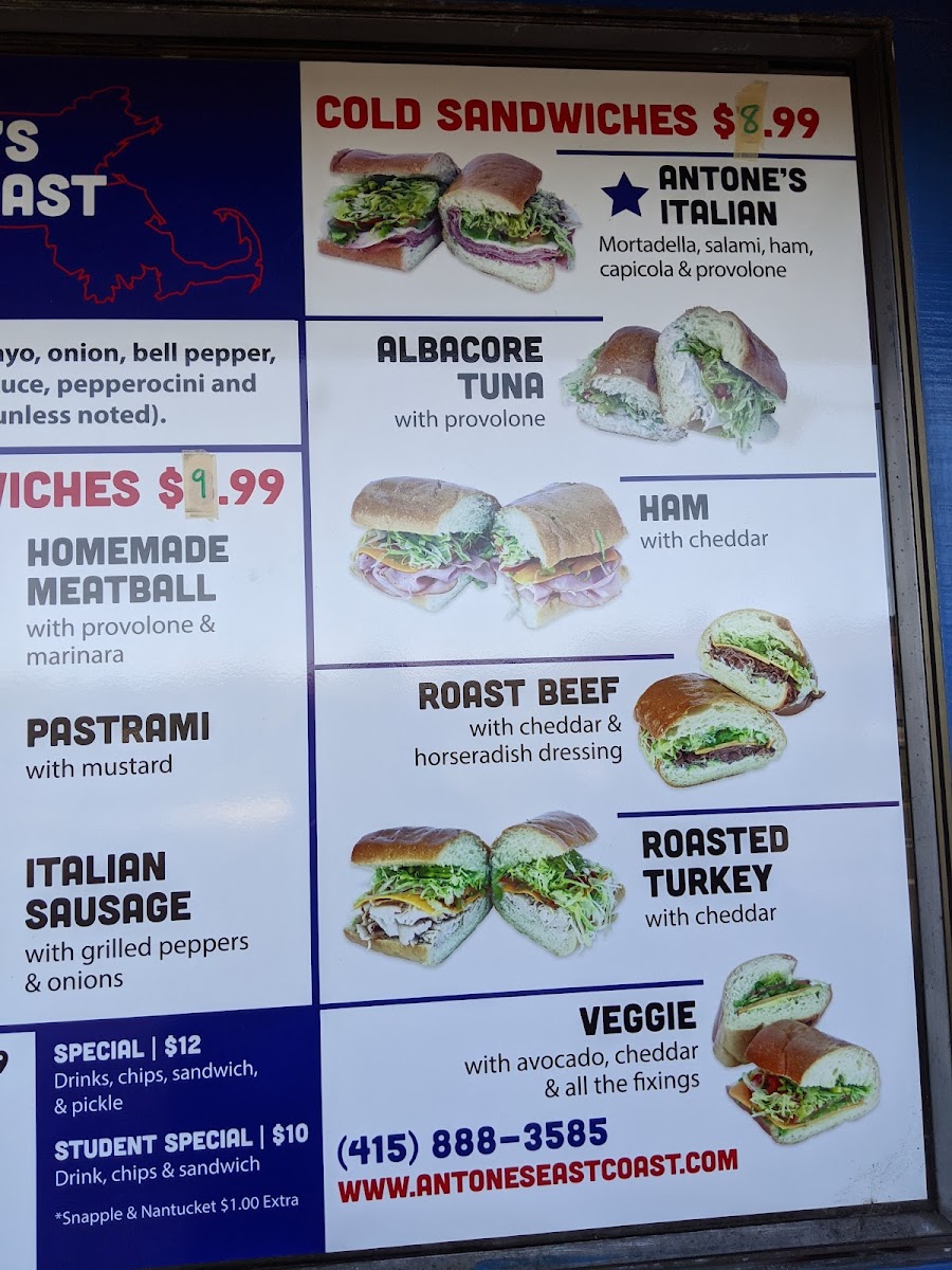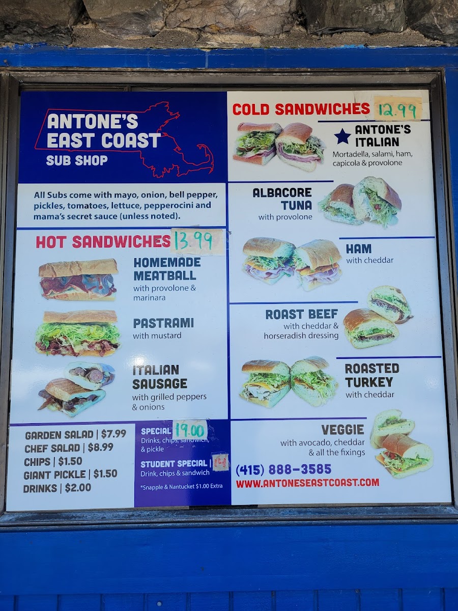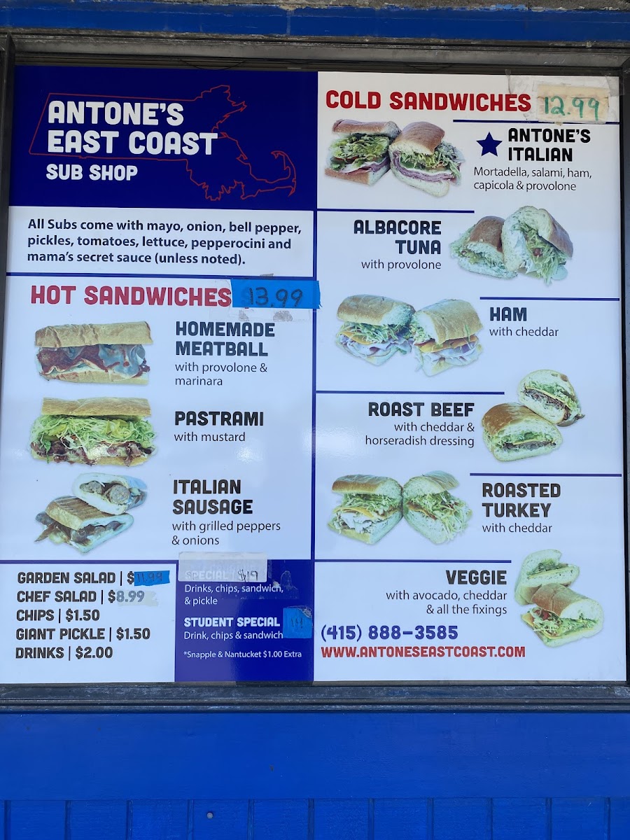 The menu at Antone's East Coast Sub Shop is centered around a variety of sandwich options complemented by salads, sides, and combo deals. It is designed to cater to customers seeking quick and casual meal choices throughout the day.